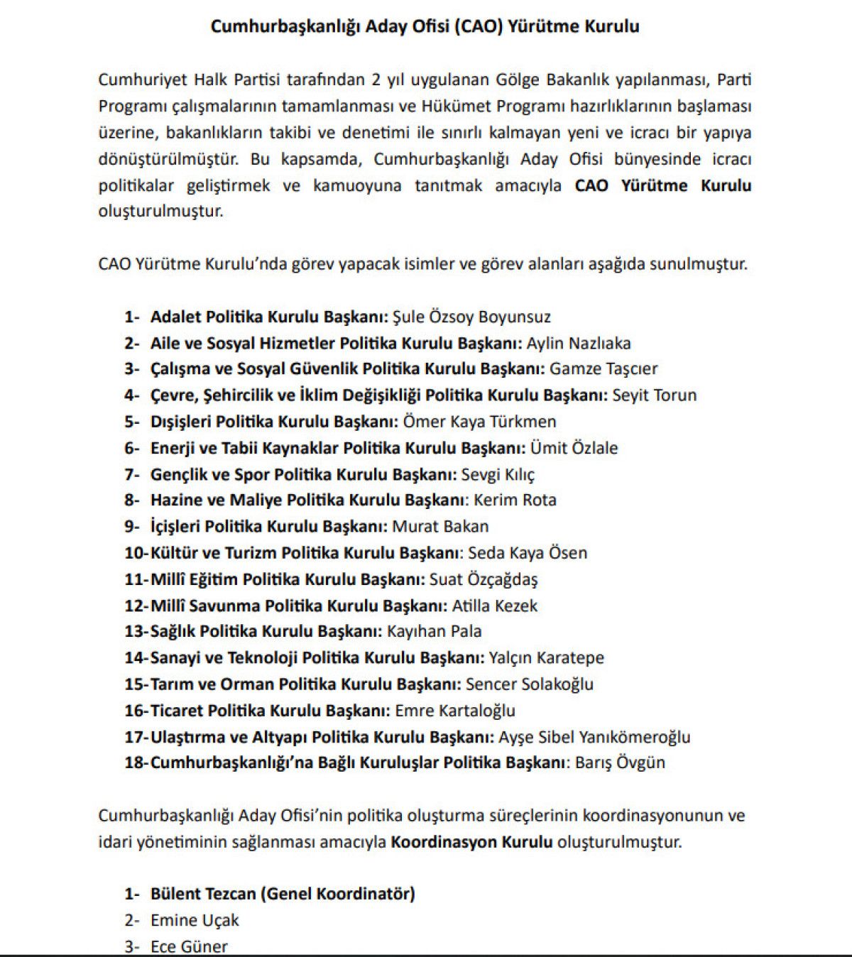 Bu kapsamda, Cumhurbaşkanlığı Aday Ofisi bünyesinde icracı politikalar geliştirmek ve kamuoyuna tanıtmak amacıyla CAO Yürütme Kurulu oluşturulmuştur.” ifadeleri kullanıldı.