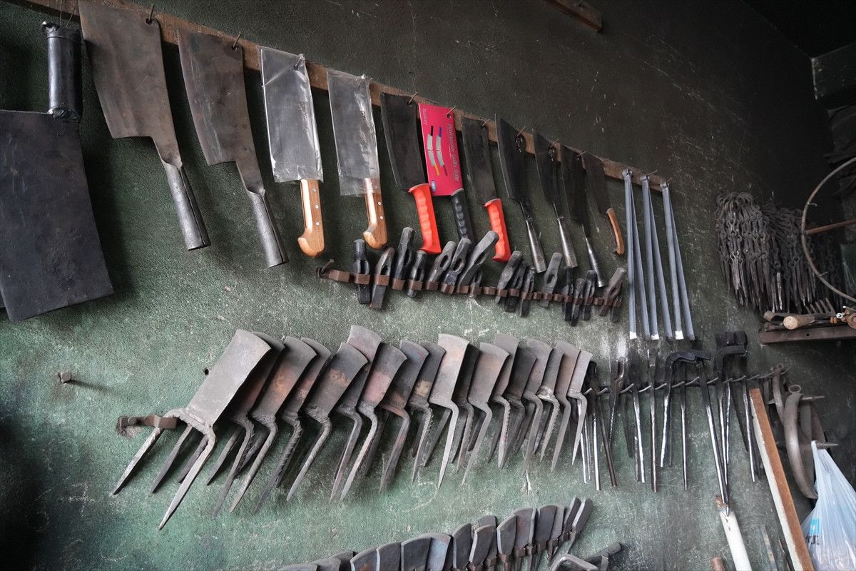 Kale Mahallesi’ndeki Eski Çarşı’da bulunan atölyesinde balta, çekiç, murç, zincir, kapı kolu, kazma ve çapa gibi aletlerin tamirini ve üretimini yapan Pınar, mesleği bugünlere kadar taşıdı.