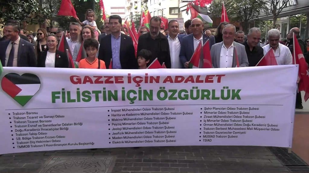 Trabzon’da 26 meslek odası ve sivil toplum kuruluşu, Gazze’ye destek yürüyüşü düzenledi. Kahramanmaraş Caddesi’nde bir araya gelen yurttaşlar, sloganlar atarak Atatürk Alanı’na kadar yürüdüler. Eylemciler, yürüyüş boyunca İsrail’i protesto ederek Gazze’yi destekleyen sloganlar attılar.